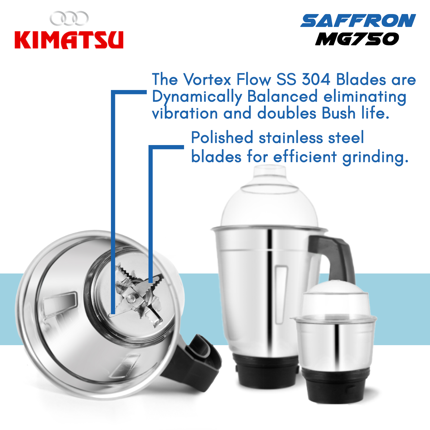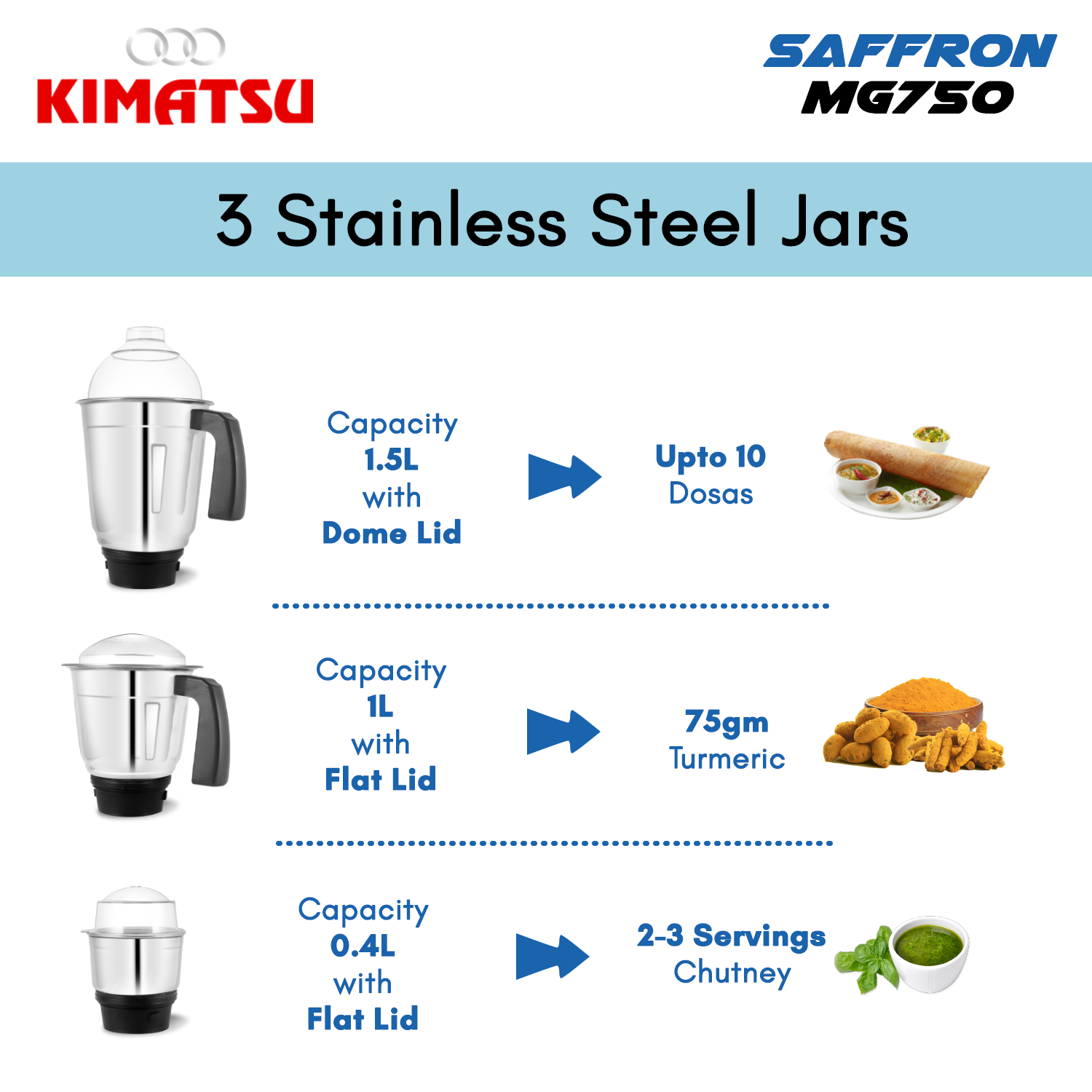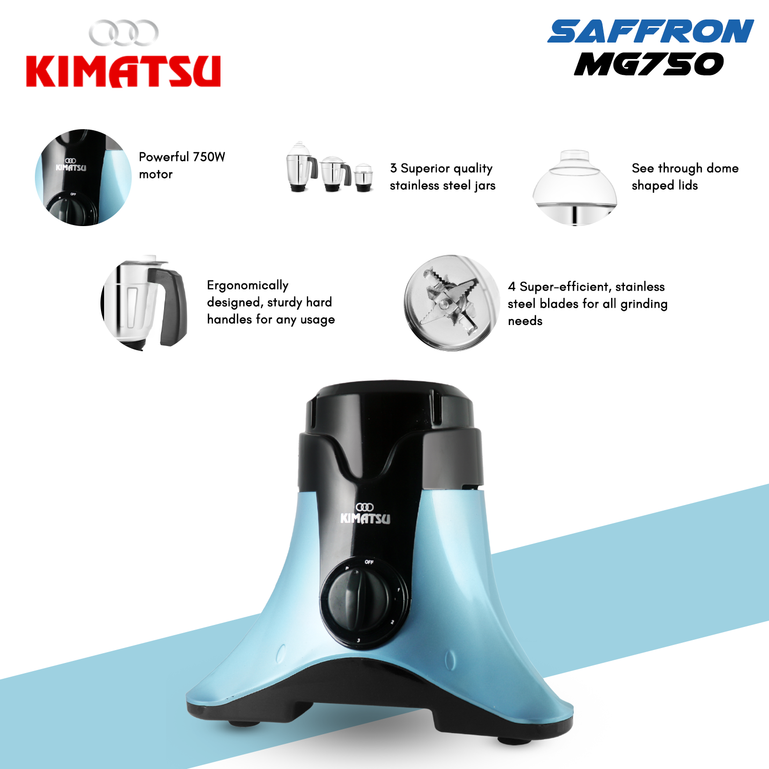 Kimatsu Saffron 750 Watt Mixer Grinder With 3 Jars for Grinding, Mixing, Blending, Juicing, With Powerful Motor (3 Years Warranty)|Sea Blue
