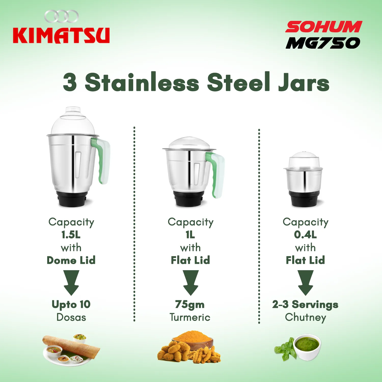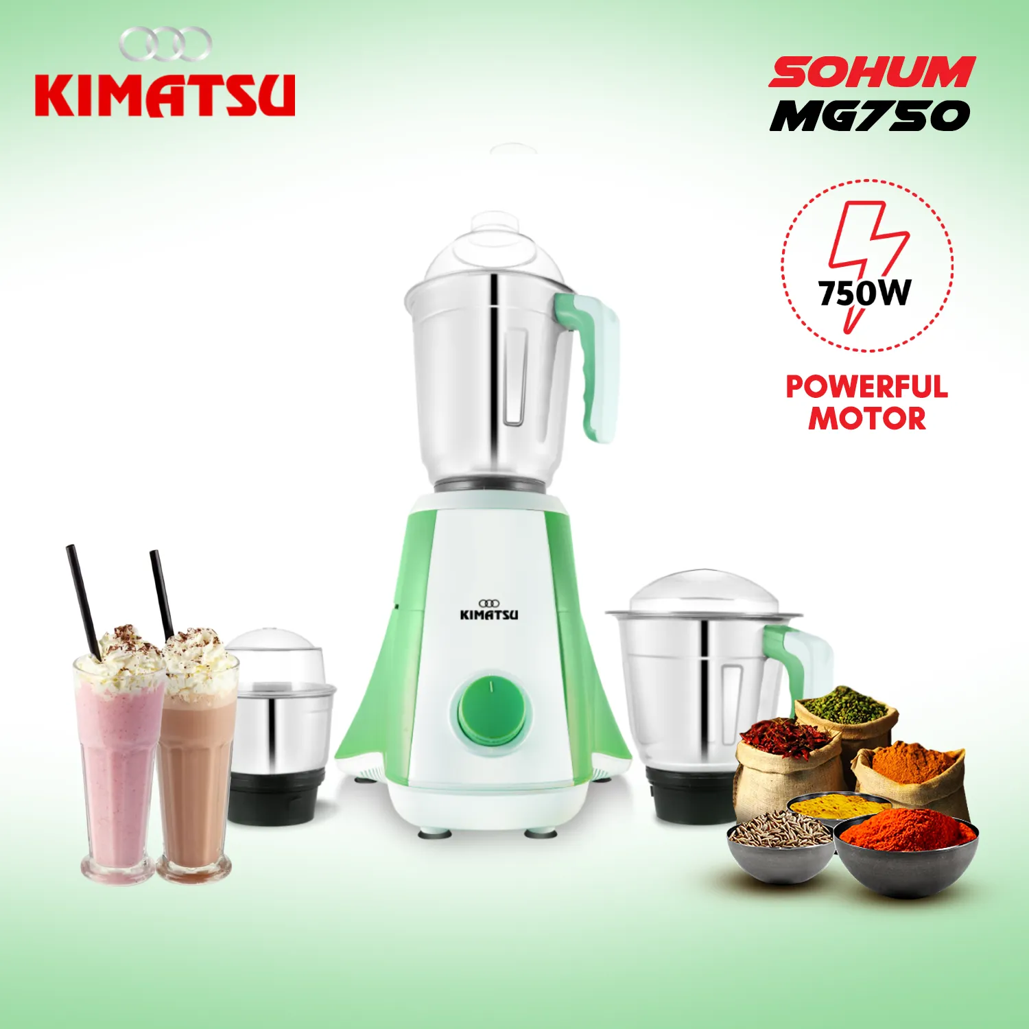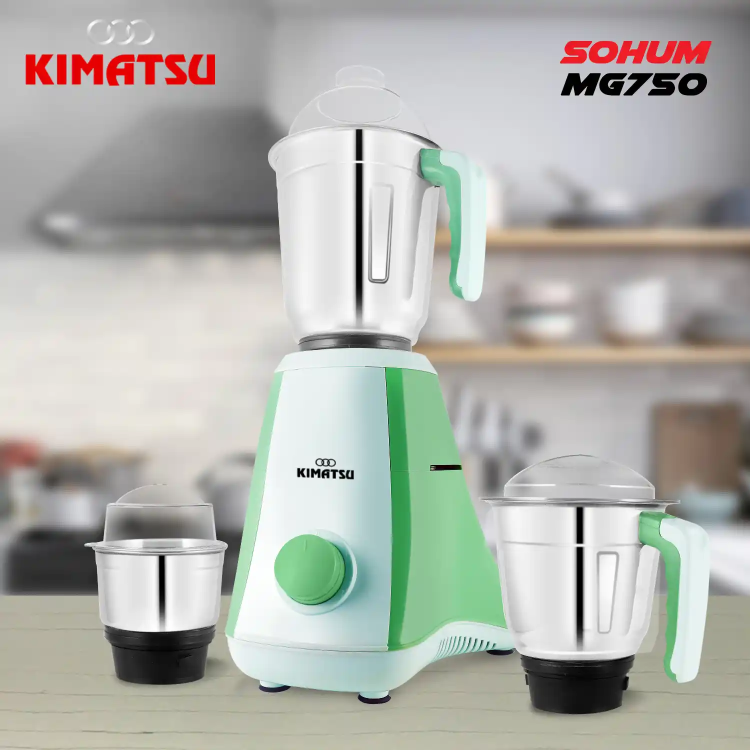 Kimatsu Sohum 750 Watt Mixer Grinder With 3 Jars for Grinding, Mixing, Blending, Juicing, With Powerful Motor (3 Years Warranty)|Pista Green